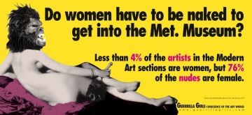 Na poslední verzi svého slavného plakátu z roku 2012 (poprvé uveřejněného v roce 1989 na autobusech newyorské veřejné dopravy) se feministická skupina umělkyň Guerilla Girls znovu ptá, zda musí být ženy nahé, aby se dostaly do Metropolitního muzea v New Yorku? A dodává: méně než čtyři procenta z umělctva zastoupeného v sekci moderního umění ve zmíněném muzeu tvoří ženy, ale až sedmdesát šest procent zobrazených aktů je ženských. Samy Guerilla Girls přitom odkazují svým plakátem na malbu francouzského malíře Ingrese z 19. století s názvem Velká odaliska zobrazující nahou ženu.