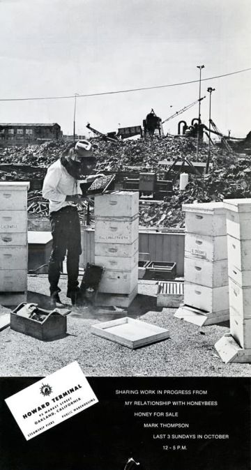 Americký umělec Mark Thompson, který je také někdy označován jako „praotec“ současného včelího umění, ve své slavné performance Immersion (1974-1976) nechal své tělo postupně pokrýt rojem včel. Na hlavu si při této příležitosti položil včelí matku umístěnou v malé klícce, takže včely postupně začaly „okupovat“ umělcovo nahé tělo.