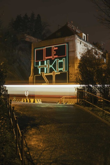As part of its Facade Project series, Kunsthalle Praha presents a textual artwork by graphic designer Aliona Solomadina from Kyiv. Her large-format light installation Lehkost [Lightness] can be seen on the façade of what was formerly Prague's Zenger electrical substation. In the work, Solomadina alludes to both the brutalist architecture of Karel Prager and Milan Kundera's famous novel The Unbearable Lightness of Being.