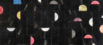 Hildebrandt’s work makes formal references to Minimalism and Abstract Expressionism, and it is also nourished by a multitude of literary, cinematographic, musical and architectural influences. He uses these cultural sources to trigger both collective and personal memories. Working mainly with analogue sound storage mediums, the German artist first started using audio cassette tapes in his paintings in the late 1990s, and in the 2000s he became interested in other recording media: VHS tapes and vinyl records. This choice of medium reflects Hildebrandt’s intense love of music, and although it accompanies him at every stage of the artistic process, never does a sound emanate from his works. Instead, sound and lyrics are embedded in the materials themselves, existing only implicitly through titles that inform us partially about their nature.