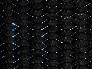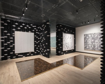 The juxtaposition of silence and sound is one of many alternating opposites that permeate Hildebrandt’s oeuvre, encompassing black and white, the visible and the invisible, sadness and joy. The distortion and dissection that his materials undergo is belied by their reflective, gleaming properties. At first glance, his paintings and installations look like beautiful surfaces that are smooth and dense. However, as one moves closer, the pictorial materials reveal their complexity.